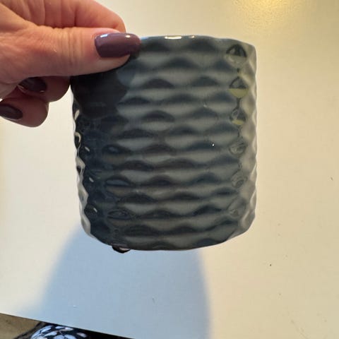 En charmerende, lille krukke med en flot, skinnende glasur i en dæmpet blågrøn farve. Krukken er ideel til mindre stueplanter, krydderurter eller som en dekorativ opbevaringsløsning.