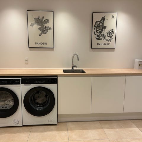 Hvidt bryggersskabe fra HTH-køkken med metal bordplade, vask og armatur i meget velholdt stand.