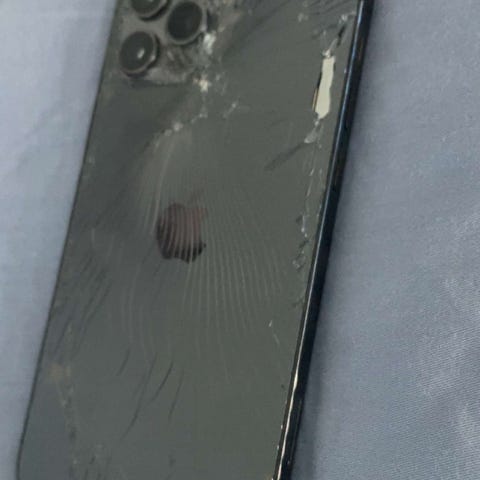 Apple iPhone 12 Pro smartphone med 128 GB lagerplads. Enheden har en sort farve og er udstyret med en glasbagside. Bemærk, at bagsiden er beskadiget med synlige revner.