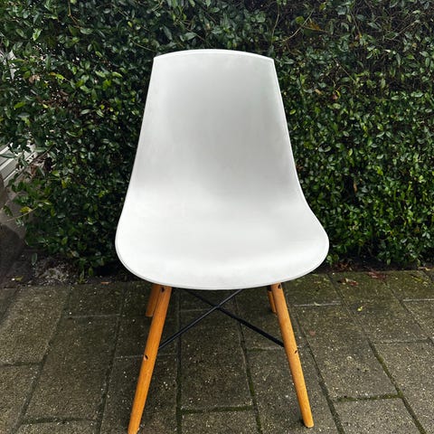 Sælger 4 x hvide spisebordsstole. Super fin stand. Har altid været brugt med pels som siddehynde på stolen.
