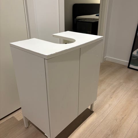Ikea vaskeskab med integreret vask i hvid. Skabet har to skuffer med runde træhåndtag, designet til opbevaring i badeværelset. Med armatur, trænger måske til en udskiftning.