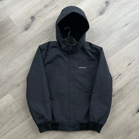 • Design: Sort jakke med lynlåslukning, klassisk krave og diskret Carhartt-logo broderet på brystet