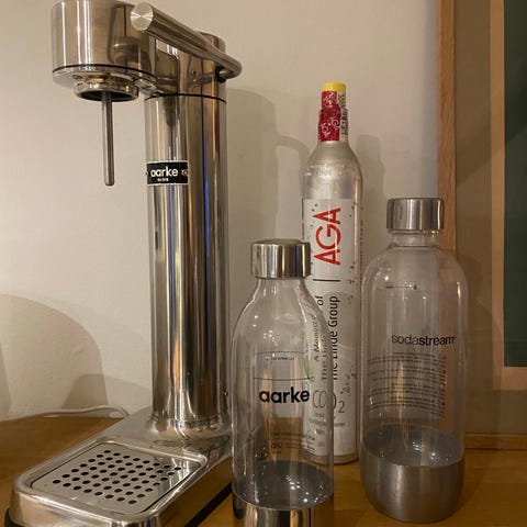 Inkl. to flasker fra Aarke og en fra sodastream, samt to patroner.