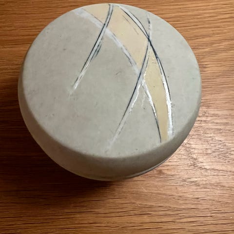 5 cm høj og 10 cm i diameter. Den lille mørke plet på kanten er ikke et afslag.