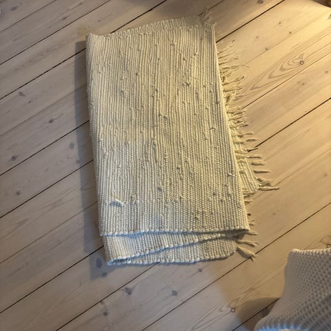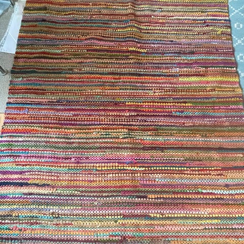Kludetæppe lavet af bomuld med flerfarvet design. Velegnet til brug på gulve for at tilføje farve og tekstur til rummet. 85x153. Sender gerne.