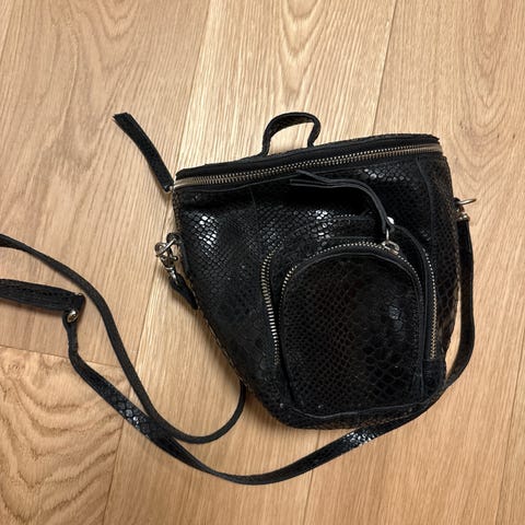 Tamaris mobiltaske i cognacfarvet læder. Tasken har flere rum og lommer til opbevaring af mobiltelefon, kort og andre småting. Den har en justerbar skulderrem og lukkes med lynlås og trykknap. Aldrig brugt. Fra ikke rygerhjem