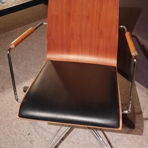 4 super fede og smukke stole i træ med hæve og sænke funktion. Hæve/Sænke funktion fungerer på alle 4 stole, de er solide og tunge. De kan hæve og sænke med en person i stolen. Sædets højde er når stolen er højst 53,5cm og når den er lavets 41 cm. Den ene stol mangler et stykke af “kæden” på læder sædet, se billede. Byd gerne