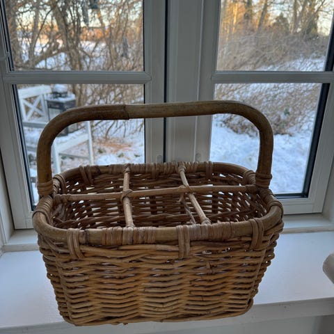 Super smuk ældre kurv i metal med træhåndtag. Måler 32 b x 21 d x 34 h .