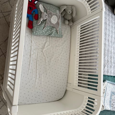 En af siderne har lige et lille hak, ikke noget som påvirker funktionen, det kan nok også fikses. Sengehestene har nogle skrammer som kunne bruge lidt hvid maling hvis det ønskes.