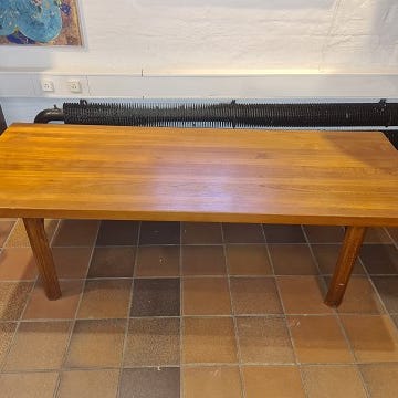 Unikt sofabord i teak. Panden kan skubbes til siden. Det måler