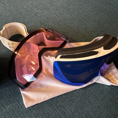 EQPE skibriller med spejlglas og elastisk bånd i lyserød farve. Brillerne har skumforing for komfort og en tilhørende opbevaringspose i stof med EQPE logo.
