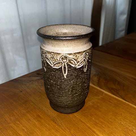 Smuk og karakterfuld vintage vase fra Løvemose Keramik, dansk studiokeramik fra 1960’erne/70’erne. Vasen er udført i kraftigt stentøj med mørk, grov glasur og lys hals med dekorativt reliefmønster i båndform.