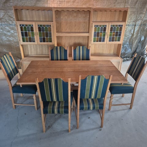 Spisebord med 2 tillægsplader og 8 stole. Skænk med 4 skuffer og 4 låger. Vitrineskab med vitrinelåge samt fyldnings låge. Samlet pris men kan købes delvis.