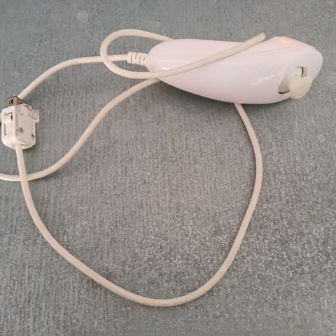 Nintendo Wii Nunchuk controller i rød og sort farve. Controlleren har en joystick og knapper, og forbindes med kabel til Wii-konsollen. Designet til brug med Nintendo Wii-spil.