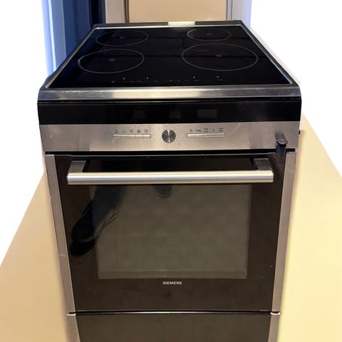 Siemens komfur HL 448201 S med 4 induktion kogeplader med touch og power boost, og varmluftovn med lynopvarmning.