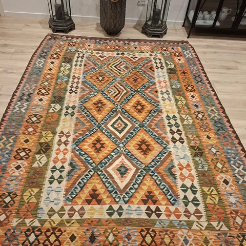 Stort og smukt håndvævet / håndknyttet kelim tæppe i uld fra røg og dyrefrit hjem i PERFEKT stand. SENDER GERNE. Måler ca 180×240. Har også et andet kelim tæppe og kelim puder til salg.