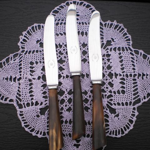 2 - retro sæt af 6 frugtknive i original æske. Skaftet af plastik og bladet af rustfristål. Se billeder. L 16,7 cm. Fin stand.