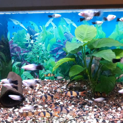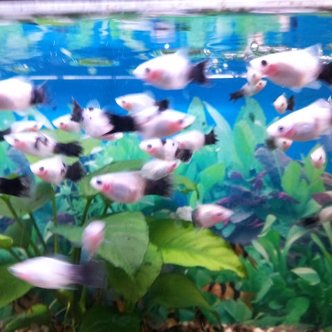 6 voksne og mindst 4 ungfisk i en god størrelse og mindst 3 unger