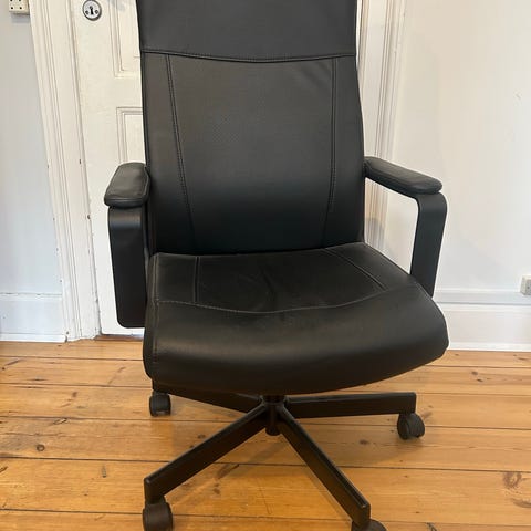 Næsten ubrugt IKEA kontorstol med træryg og polstret sæde. Stolen har et hvidt stel og en træryg med en naturlig finish. Sædet er polstret med lyst stof. Sædehøjden kan justeres. Velegnet til brug ved skrivebord eller som kontorstol.