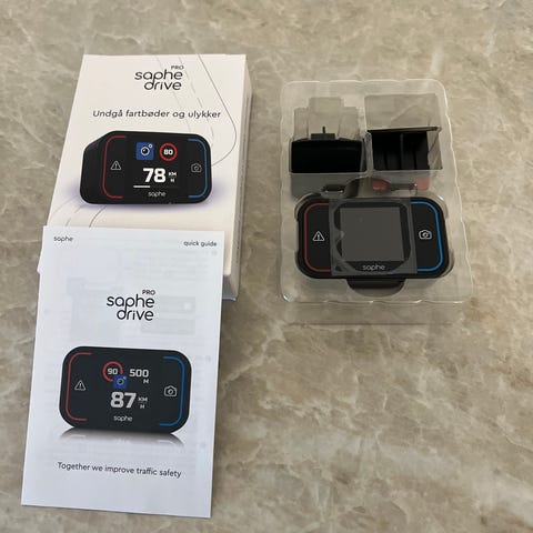 Saphe Drive fartovervågningsenhed med digital skærm. Enheden hjælper med at undgå fartbøder og ulykker ved at give føreren relevante advarsler under kørslen.