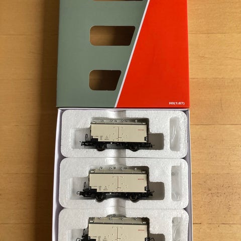 Hobby Trade 39003 - DSB godsvogne - 4-vognssæt - QR 35 997 m/skruebremse i højt bremsehus - QR 36 015 hvid m/skruebremse i højt bremsehus - IB 18 963 kølevogn m/rød påskrift (stor) “KØLEVOGN” m/skruebremse i højt bremsehus - TH 9035 ballastvogn - epoke II/III - skala 1:87 - HO.