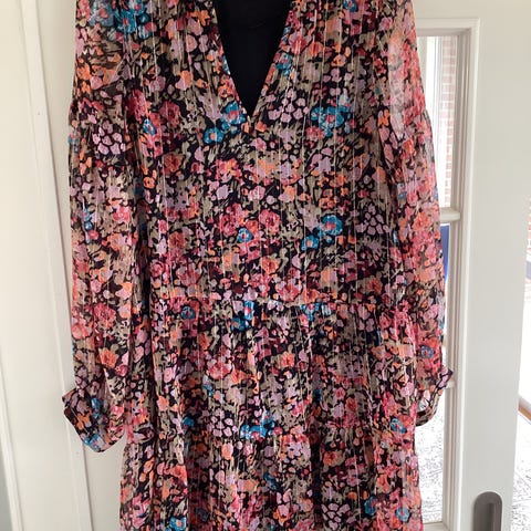 Smuk og iøjnefaldende kjole fra JDY i str. 42. Klassisk slå-om look med v-hals, lange ærmer og bindebælte, der fremhæver taljen. Kjolen har et flot flerfarvet blomsterprint på sort bund, som gør den perfekt til både hverdag og festlige anledninger.