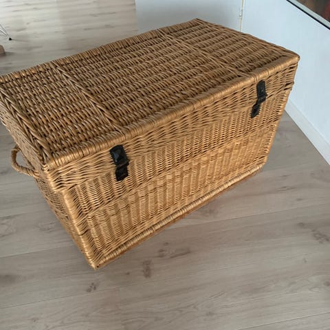 Stor og rummelig opbevaringskiste i flet/pil med låg.