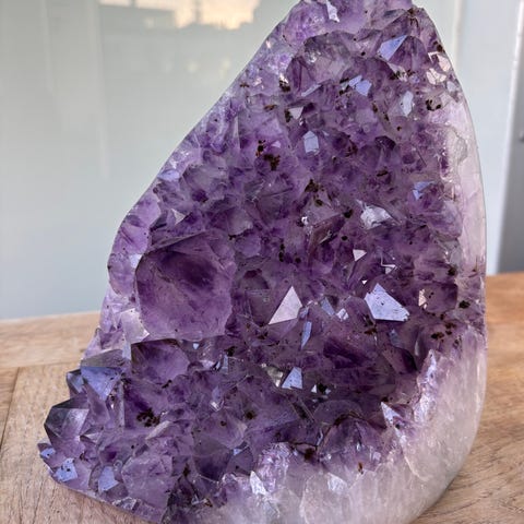 Sælger en flot og massiv ametystgrotte fra Brasilien. Et markant statement-piece til indretning eller samling – står stabilt og ser fantastisk ud i både dagslys og aftenlys.