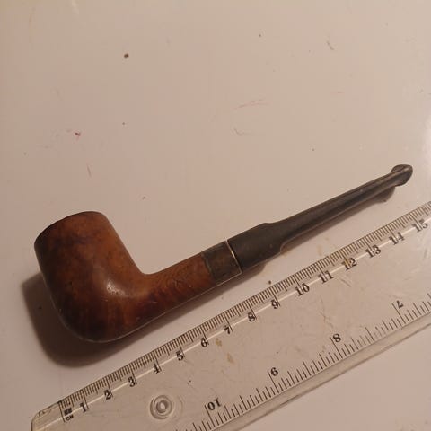 Rattray's tobakkspibe fremstillet i træ med mundstykke i plastik. Piben har en buet form og en naturlig træfarve. Der står Petersson Dublin på. Og Sterlingsølv.