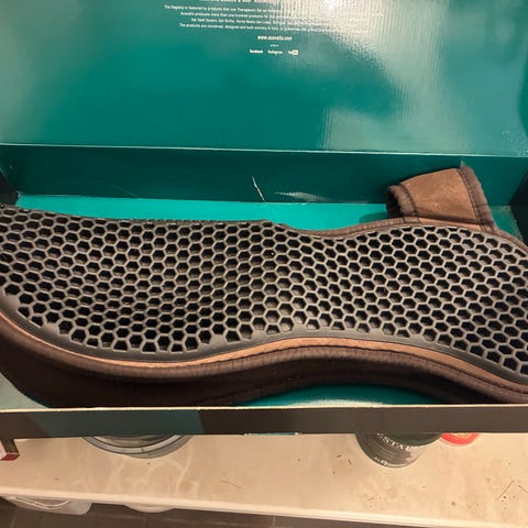 Acavallo Gel Pad med memory foam og frontløft. Jeg har brugt den til 16" og 17" sadel, hvor den passer fint. Hjælper med at fordele tryk og sikrer at sadlen ikke glider frem. Ny pris ca. 1400 kr.