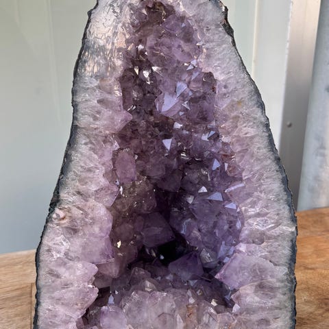 Sælger en flot og dekorativ ametyst geode/katedral fra Brasilien. Et imponerende stykke naturkunst med en dyb krystalhule og smuk lilla farve – perfekt som statement-piece i stuen, på kontoret eller som samlerobjekt.