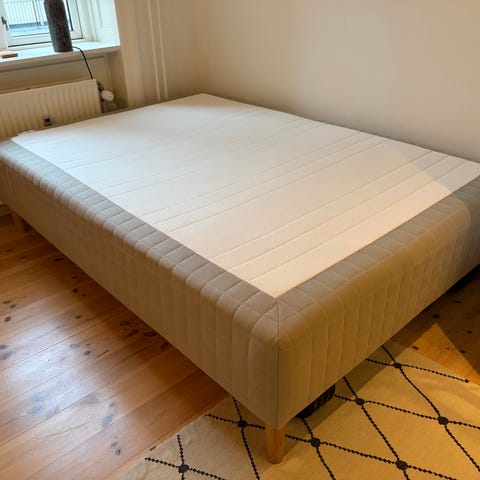 IKEA Skårer madras med målene 140x200 cm. Boxmadras inkl topmadras. Ben i egetræ. Cirka 5 år gammel.