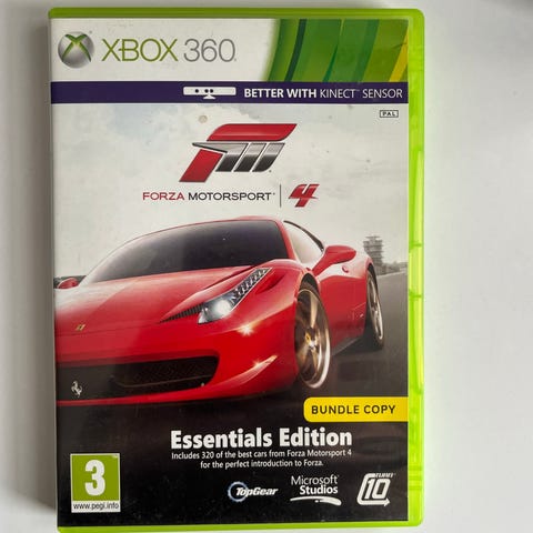 Forza Motorsport 4 Essentials Edition til Xbox 360. Bilracespil med realistisk grafik og gameplay. Indeholder basisspillet og er kompatibelt med Kinect-sensor. Egnet til alle aldre fra 3 år og op.