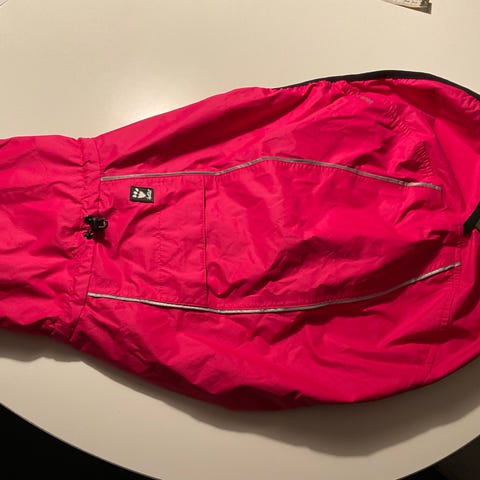 Regnjakke fra mærket “Hurtta” til hund, fejler ingenting og fungerer som den skal! Har indbygget krog til at sætte hundesnor fast i, har elastikker til benene og fastspændes rundt om maven.