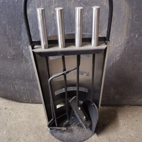 Klassisk pejsesæt i firkantet sort jern på vippefri trefod med ildrager, kost, skovl og brændetang.