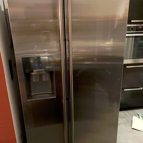 Samsung Side-by-Side køleskab i rustfrit stål. Modellen har dobbeltdøre med integreret is- og vanddispenser. Køleskabet er designet til opbevaring af madvarer med separate sektioner til køl og frys.