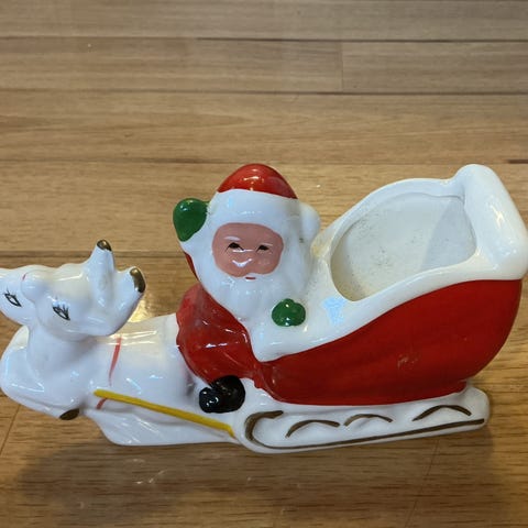 Flot stor kane med julemand og rensdyr. Der er plads til blomster, gaver, kogler eller anden form for dekoration bag i slæden. Jeg har haft den fyldt med oasis, fint grønt bunddække, røde bær og pakker i guldpapir.