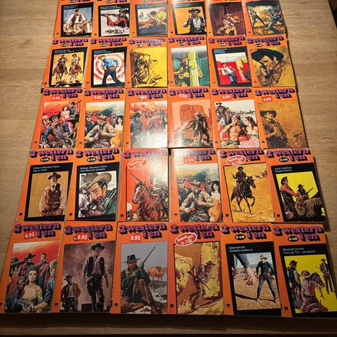 Samling af forskellige western bøger med varierende forfattere og titler. Bøgerne omhandler western-temaer som cowboys, pionerer, og eventyr i det vilde vesten. Bøgerne er i paperback format og indeholder forskellige historier inden for western genren.