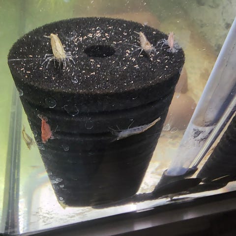 Rejer i forskellige farver. Kan hjælpe med at holde akvariet rent ved at spise alger og madrester.