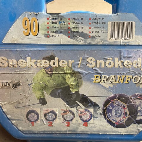 Branford snekæder med en længde på 100 cm. Uåbnet, købt til en bil vi ikke længere har. Snekæderne er beregnet til montering udenom bildæk for at forbedre trækkraft under is- og sneglatte køreflader.