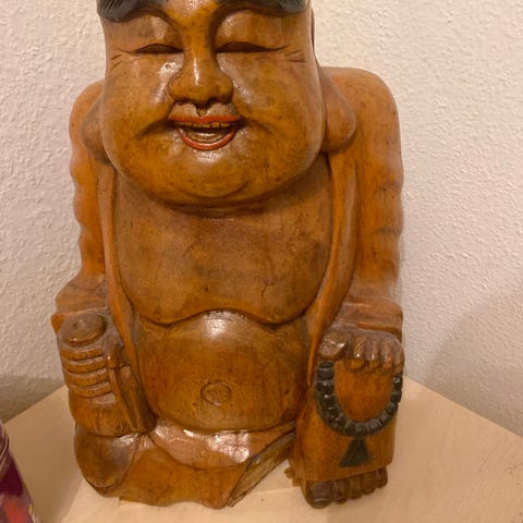 Træfigur af Buddha siddende i meditationsstilling med hænder i bøn. Figuren har detaljeret udsmykning bag og under Buddha. Fremstillet af træ med naturlig brun farve.