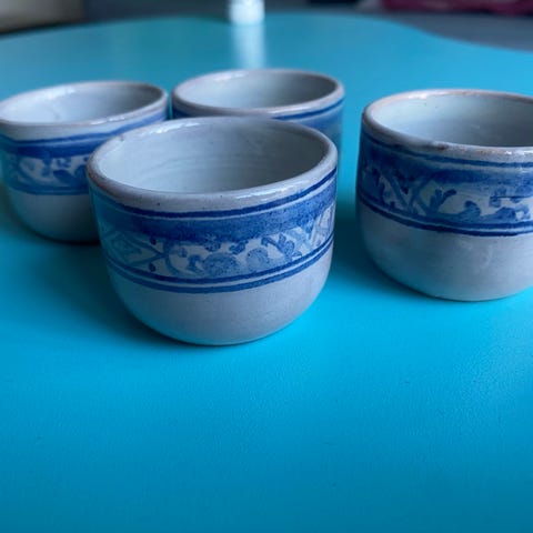 To keramiske krus med unikke ansigtsdesigns. Krusene er håndmalede med forskellige farver og detaljer, og de har en rund form med en åbning øverst. Velegnede til servering af varme drikke.