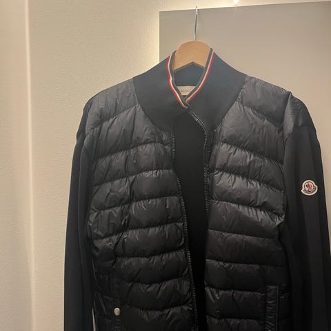 Klassisk Moncler jakke med dun fortil og strik på rug og ærmer.