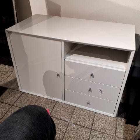 Skabet har en kombination af en hvid øverste del og en sort nederste del. Forneden ef der 3 hylder og øverste del er inddelt i 4 rum,,Afhentes i:,Røde Kors Ølby/Køge (259),Bemærk at mail, chat og beskeder ikke besvares, og varen skal købes på knappen "Gå til varen"