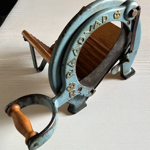 Produktet er en meget gammel, sort Raadvad brødmaskine med træhåndtag.,Afhentes i:,Røde Kors Ølby/Køge (259),Bemærk at mail, chat og beskeder ikke besvares, og varen skal købes på knappen "Gå til varen"