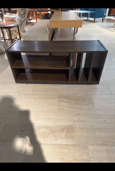 Møblet er en moderne tv-bænk med hylder og skuffer. Det er lavet af træ i lys og mørk finish.,Afhentes i:,Røde Kors Kolding (621),Bemærk at mail, chat og beskeder ikke besvares, og varen skal købes på knappen "Gå til varen"
