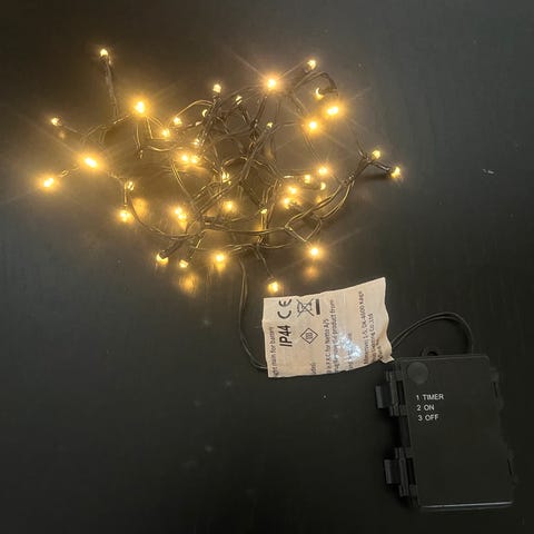 Lyskæde, Lyskæde med 10 lyspærer til ophængning i klynge eller længde 150cm. Strømkilde 2 AA batterier i boks med afbryder. vkt