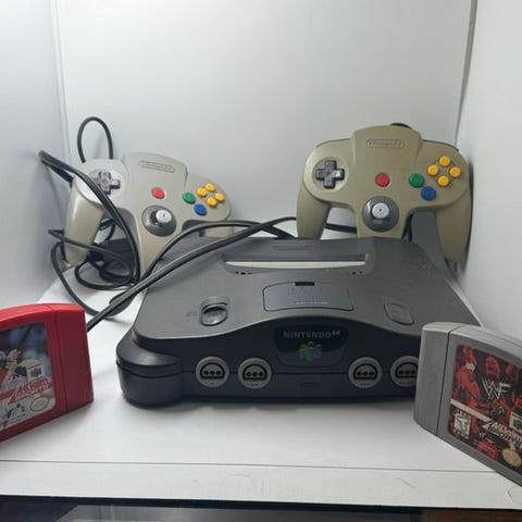 Nintendo 64, fremstillet i 1996, brugt, testet og i drift, med spil. Klik på den blå "gå til varen" knap, for at købe eller byde på denne vare. Den samlede pris vil blive vist inden du afgiver dit bud.