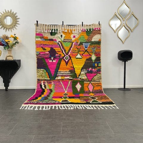Oprindelse: Marokko; Model: Berberteppe Azilal i uld fra Det Centrale Atlas, boheme marokkansk stil, 100% fåreuld, uldtættelse, dimensioner 257 x 160 cm, i rigtig god stand og professionelt renset. Klik på den blå "gå til varen" knap, for at købe eller byde på denne vare. Den samlede pris vil blive vist inden du afgiver dit bud.