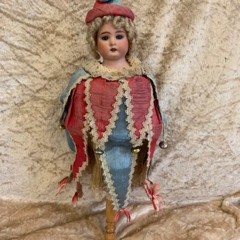 AT Kestner 12-tommer antik tysk bisque-dukke med socket-hoved, brune søvnøjne og mohair-wig på en tidlig sammensat træ-leddet krop, iført en original rød bomuldskjole med kyse, undertøj, strømper og lædersko; generelt fremdriftsfuld og over 200 år gammel, pakket i en erstatnings emballage. Klik på den blå "gå til varen" knap, for at købe eller byde på denne vare. Den samlede pris vil blive vist inden du afgiver dit bud.